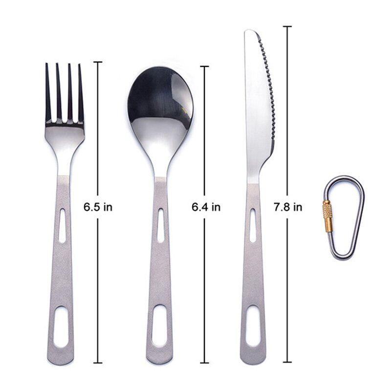 This Titanium Cutlery Set comes with a spoon, a fork, and a knife. The three titanium utensils from Bosetitanium are held together with a removable titanium carabiner.
