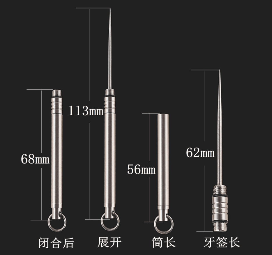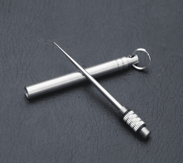 This toothpick hides on your keychain when not in use. Unscrew the cap, turn it around, then screw it back on with the pick.
